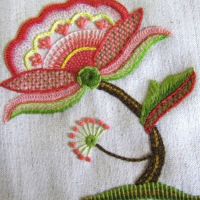 | Crewel-Work ist eine sehr alte, farbige Stickerei, die von einer Stichvielfalt und von unendlich vielen Stichkombinationen lebt. Sie ist in englischsprachigen Ländern zuhause. Es wird klassisch mit Wolle auf einem dicht gewebten Stoff gearbeitet. | |